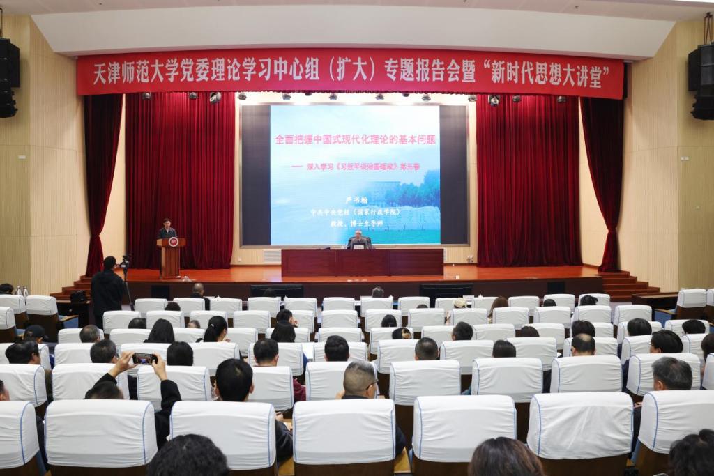 本站讯 为学习贯彻落实党的二十届四中全会精神,深入学习《习近平谈治国理政》第五卷,增强用习近平新时代中国特色社会主义思想武装头脑、指导工作的政治自觉、思想自觉和行动自觉,11月5日,我校在会议中心大报告厅召开校党委理论学习中心组(扩大)专题辅导报告会暨“新时代思想大讲堂”第10讲,邀请中央党校、中国社会科学院世界社会主义研究中心副主任严书翰教授作报告。校领导班子成员,派驻纪检监察组和全校中层干部,教职工党支部书记、专任教师党支部书记,思政课教师,民主党派代表,学生代表等近400人聆听了专题辅导报告会。