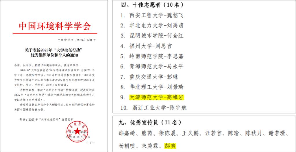 本站讯(通讯员 陈洁)近日,从中国环境科学学会传来喜讯,在最新发布的《关于表扬2025年“大学生在行动”优秀组织单位和个人的通知》中,我校地理学部师生表现突出,郝爽老师荣获“优秀宣传员”称号,高峰岩同学荣获“十佳志愿者”称号。这一荣誉不仅是对两位师生个人的肯定,更是对学部实践育人成果的充分认可。