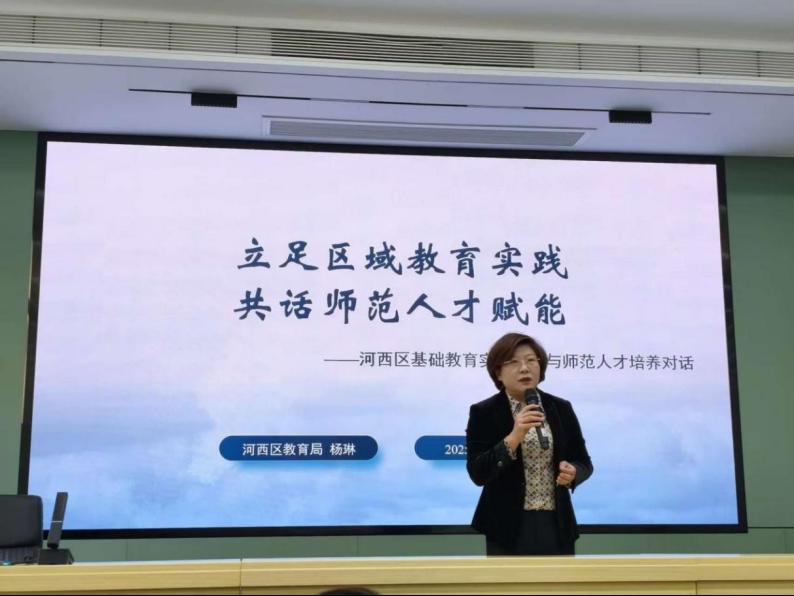 培训会上,杨琳以“立足区域教育实践,共话师范人才赋能”为题,结合自身在天津师大的求学经历和深耕教育领域多年的丰富实战积淀,以天津市河西区教育发展的翔实数据为支撑,从师资结构、生源特点、课程改革需求等多个维度,精准剖析了当前区域教育在高质量发展阶段对师范人才的核心诉求与能力标准。她指出,新时代区域教育对人才的需求已从“胜任型”向“复合型”“创新型”转变,既要求师范生具备扎实的学科功底,更需拥有较强的育人实践能力、课程研发能力与家校协同意识。