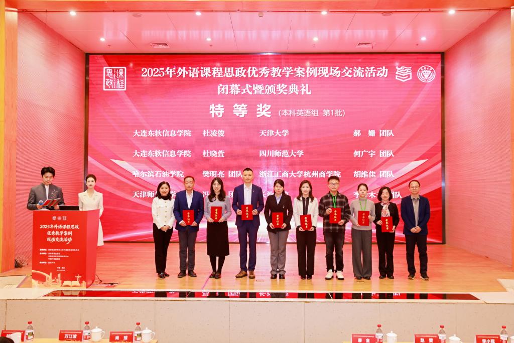 本站讯(通讯员 陈乾坤)11月21日至23日,2025年外语课程思政优秀教学案例现场交流活动暨全国普通高等学校大学英语课程思政教学竞赛全国总决赛在重庆大学虎溪校区举办。由我校外国语学院李艳玲、冯瑞玲、许晓津、石秀虹、李英杰组成的教师团队,凭借出色的教学设计和精彩的现场展示,在决赛中脱颖而出,荣获全国特等奖。