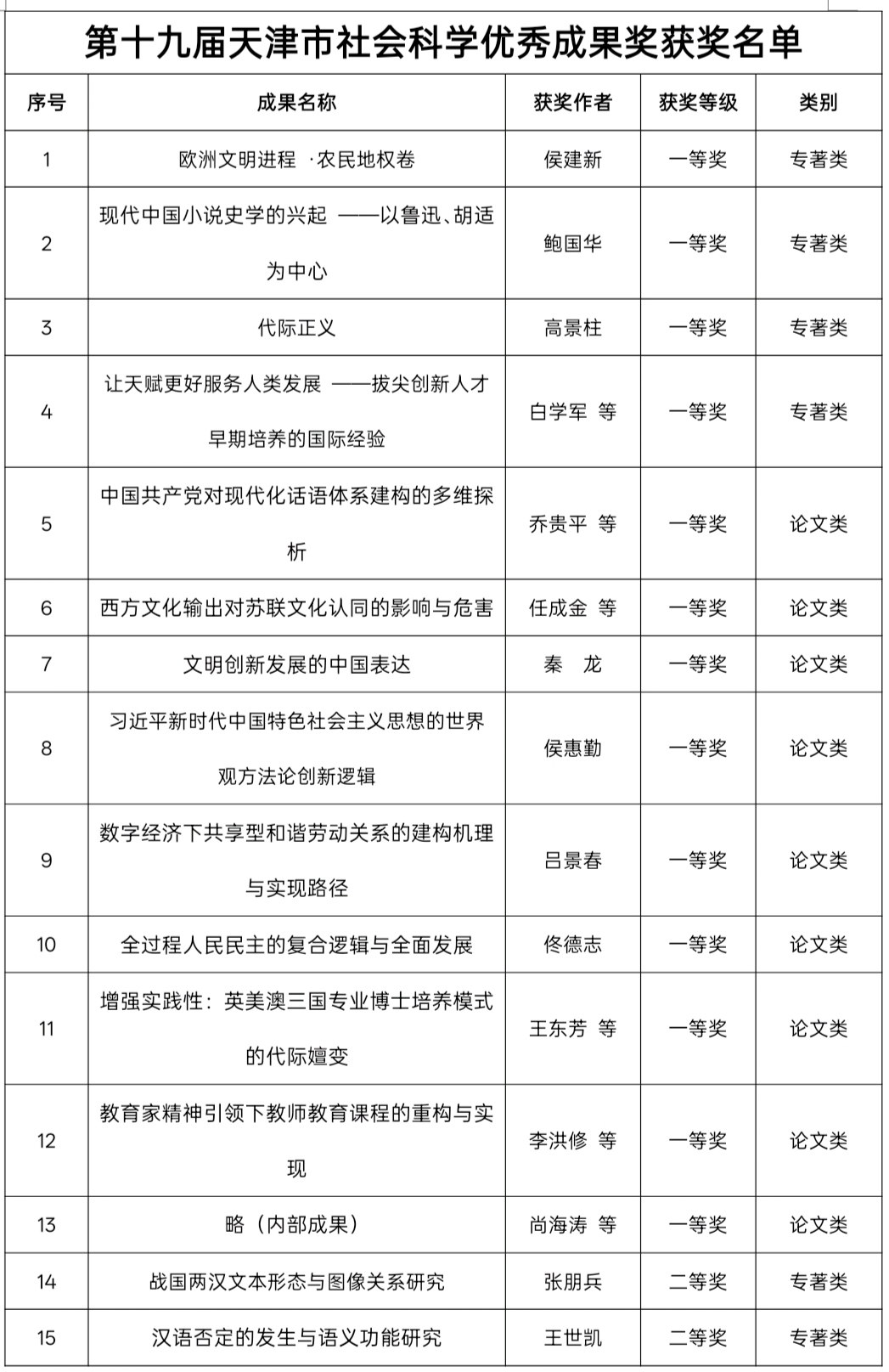 本站讯(通讯员刘铄华)近日,第十九届天津市社会科学优秀成果奖公布,我校再创佳绩,共有55项成果获奖,占奖项总数的16.77%,位列天津市第二,市属高校第一。