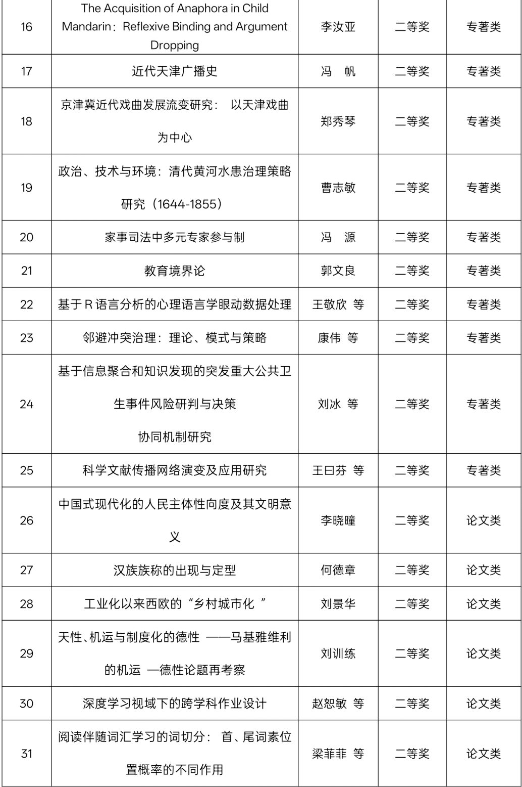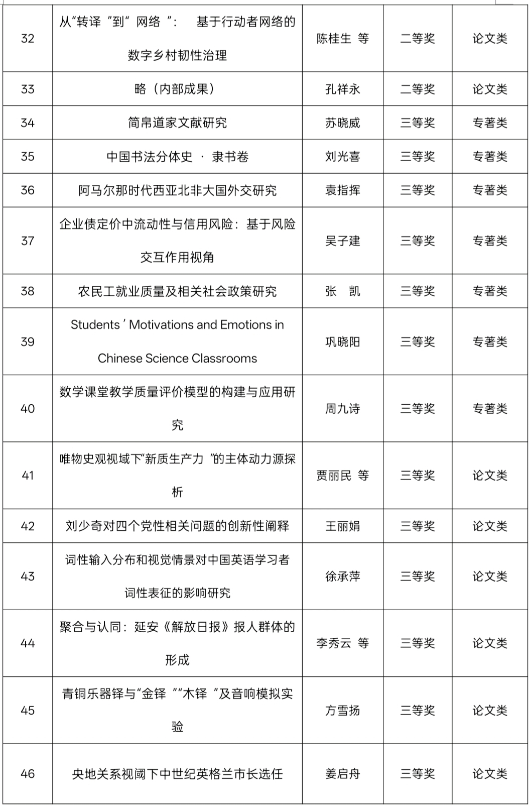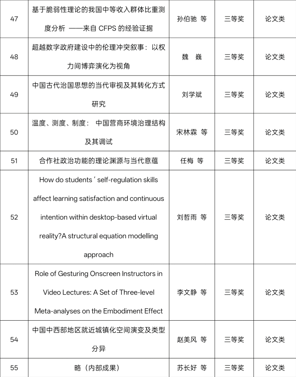 在55项获奖成果中,政治与行政学院12项,教育学部7项,马克思主义学院6项,心理学部、文学院分别4项,经济学院、历史文化学院、欧洲文明研究院、外国语学院分别3项,法学院、新闻传播学院分别2项,管理学院、大数据科学研究院、国际教育交流学院、美术与设计学院、音乐与影视学院、地理学部分别1项。