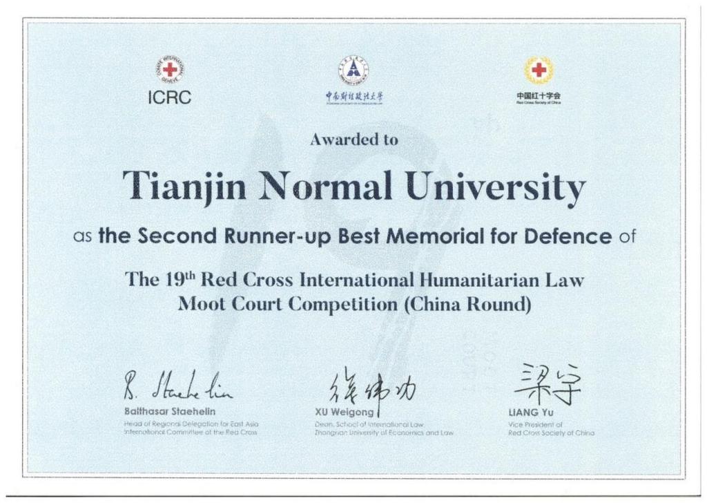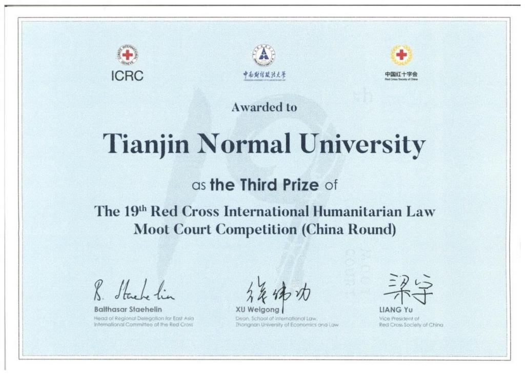 本站讯(通讯员 蔡雨婷)近日,第十九届红十字国际人道法模拟法庭竞赛(英文赛)在武汉举办,由法学院学生组成的天津师范大学代表队斩获全国三等奖、辩方最佳书状奖,实现了在该项竞赛中的新突破。