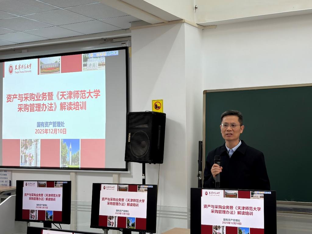 本站讯(通讯员 张彦茹)为保证《天津师范大学采购管理办法》于2026年1月1日顺利实施及新升级的物联网资产管理系统顺利启用和平稳运行,12月10日下午,我校召开资产与采购业务暨《天津师范大学采购管理办法》解读培训会。校党委常委、副校长秦龙出席会议并讲话。校内各单位、各部门分管资产、采购工作的负责人,资产管理员,采购管理员以及部分科研项目负责人参会。培训会由国有资产管理处处长王振国主持。