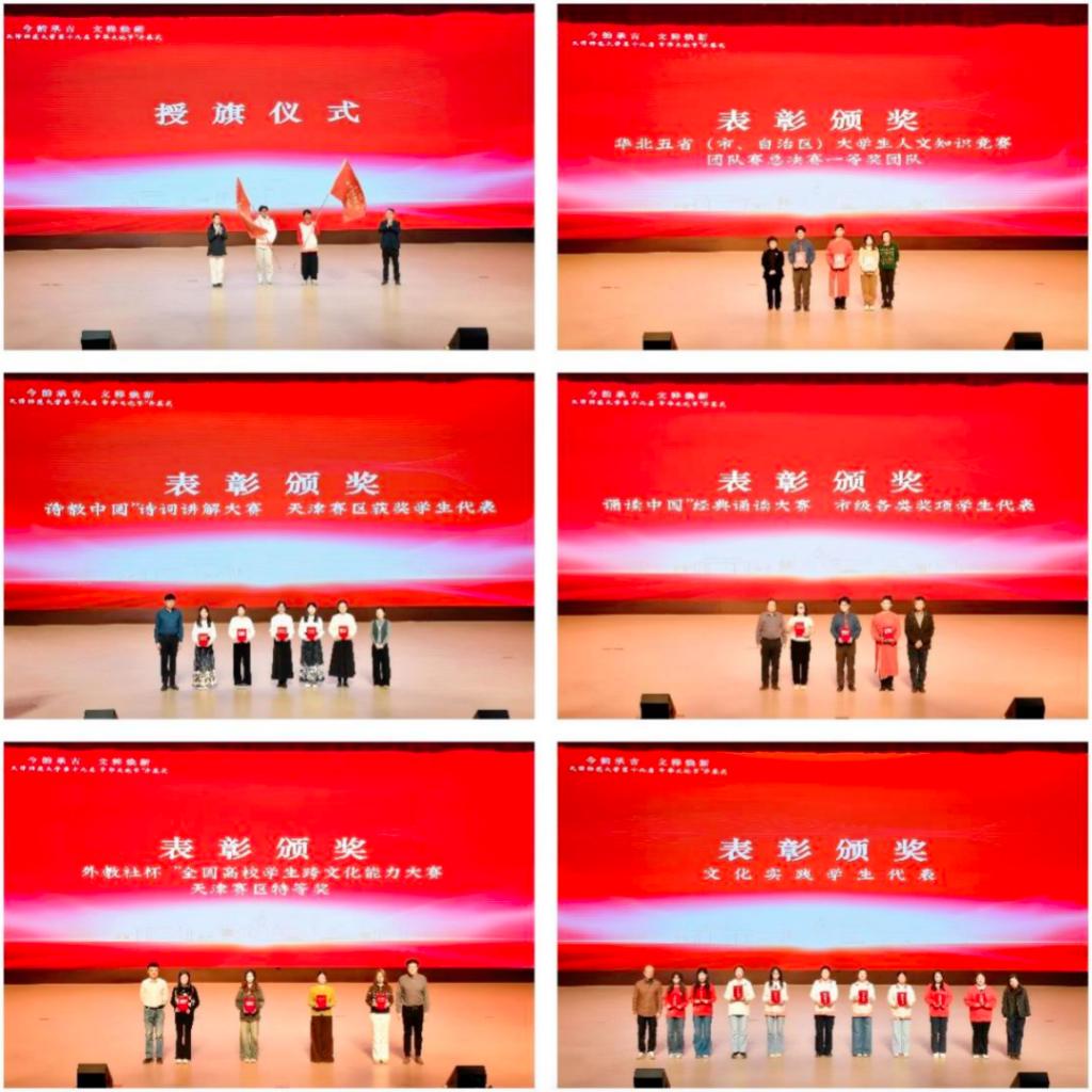 开幕式上,学校有关负责同志为华北五省(市、自治区)人文知识竞赛一等奖团队、“诗教中国”“诵读中国”“外教社杯”获奖学生和文化实践工作突出表现学生代表颁奖。文学院党委书记李静、院长赵利民为文学院2025年“星火燎原”中华优秀传统文化志愿服务队和宣讲团授旗。
