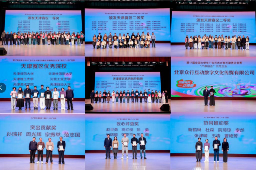 今年适逢大广赛创办二十周年,活动特设天津赛区“津彩二十年”回顾环节。活动现场以视频形式深情致敬已故原天津师范大学新闻传播学院广告学系主任许椿,并颁发“突出贡献奖”“匠心评委奖”“协同推动奖”,向长期以来为赛区发展做出贡献的各界人士致谢。二十年来,天津师范大学始终是大广赛天津赛区竞赛承办方,在市教委的指导下,推动赛事从最初的百余件参赛作品,发展为年均征集量近万件、吸引两万余名学生与两百余位指导教师参与的市级学科竞赛,实现了跨越式发展。