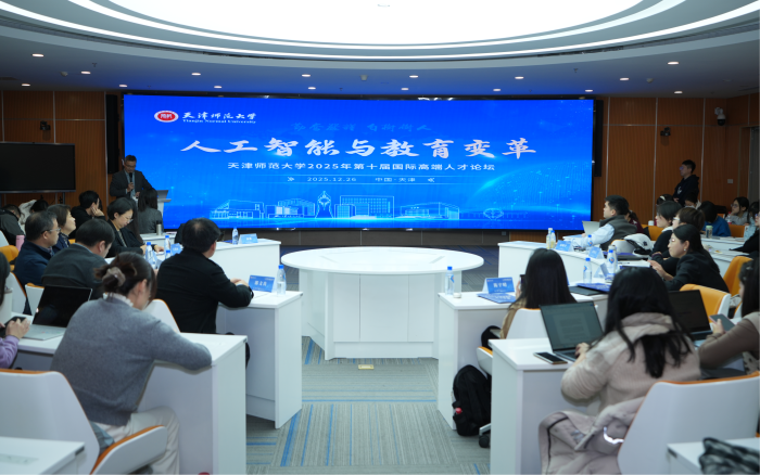 本站讯(通讯员 王立冬)2025年12月26日,天津师范大学第十届国际高端人才论坛——教育人工智能分中心(教育+)分论坛在京津冀教师发展协同创新中心B座圆桌报告厅举办。本次分论坛聚焦“人工智能与教育变革”的主题,旨在深入贯彻落实《教育强国建设规划纲要(2024—2035年)》要求,推动教育学科与人工智能的深度交叉融合,汇聚海内外人才智慧,为学校引进高层次人才搭建平台。高端人才代表、学校人事处和教育学部相关负责同志及师生代表100余人参加了本次论坛。