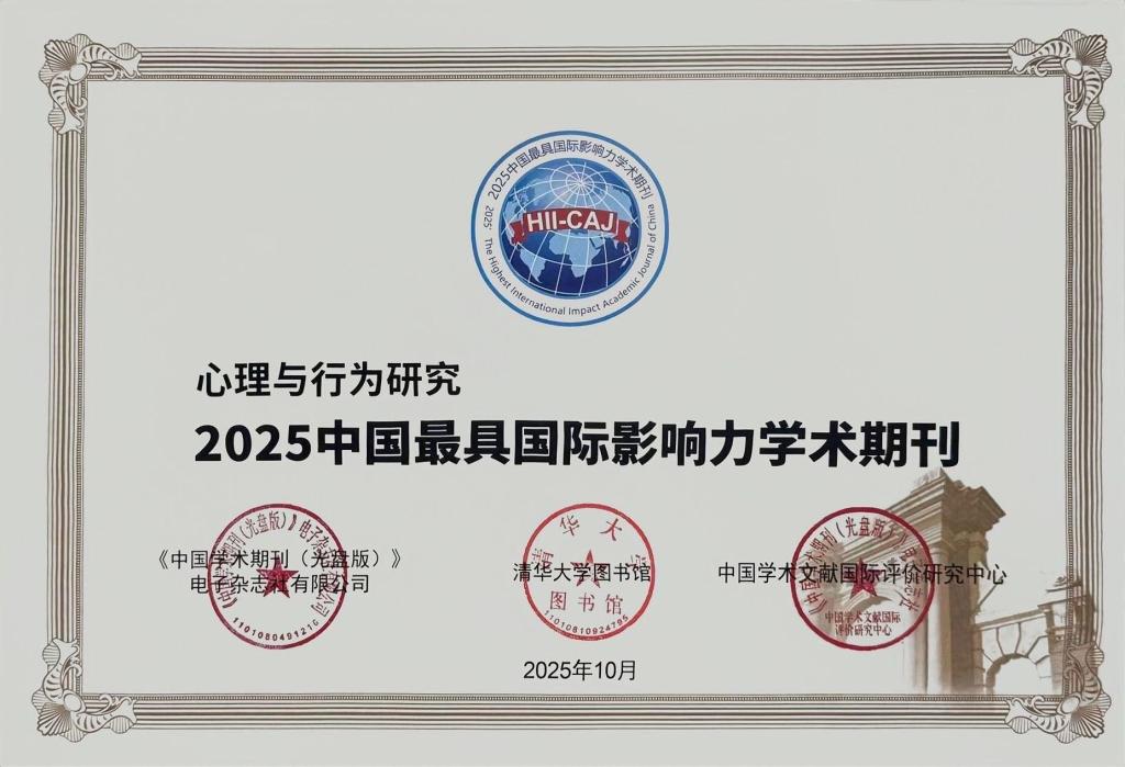本站讯(通讯员 于海涛)近日,中国知网正式发布2025年度“中国最具国际影响力学术期刊”榜单。天津师范大学主办的《心理与行为研究》再度入选“中国最具国际影响力学术期刊”,在人文社科类中文期刊中位列第43位,实现连续六年入选该榜单。