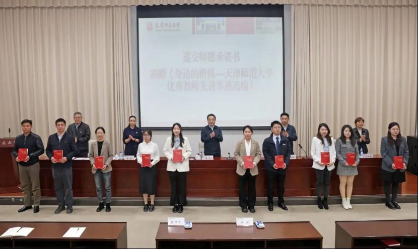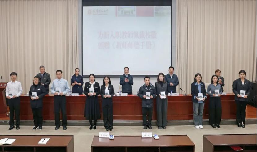 会上,校领导为新入职教师代表佩戴校徽、颁赠《教师师德手册》和《身边的楷模——天津师范大学优秀教师先进事迹选编》。新入职教师代表向校领导递交师德承诺书。在天津师范大学优秀教师吴建永的带领下,全体新入职教师面向校旗郑重宣誓。