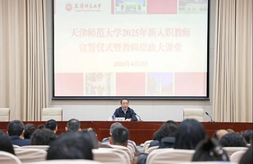 曲凯以“坚守教育初心 勇担强师使命 以教育家精神聚力‘十五五’阔步启航”为题,为新入职教师讲授师德师风专题思政课。他回顾了“十四五”期间,学校全面贯彻落实习近平总书记视察天津提出的“四个善作善成”重要要求,以第九次党代会精神为行动纲领,系统布局“攻坚提质”行动计划,在坚守师范报国初心、落实立德树人根本任务、服务国家发展大局、以有组织科研推动学科建设等高质量发展中取得的显著成果。