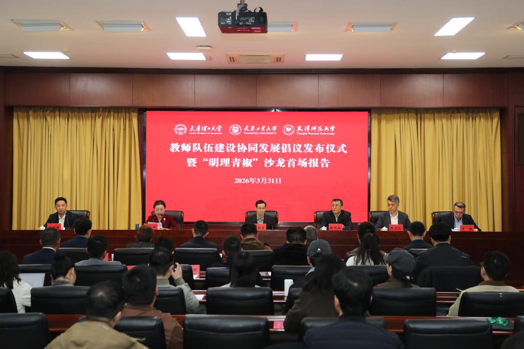本站讯(通讯员 孙智慧)近日,我校与天津理工大学、天津工业大学教师队伍建设协同发展倡议发布仪式暨“明理青椒”沙龙首场报告在天津理工大学举办。天津理工大学党委副书记、校长陈胜勇,市教育两委人事处处长、二级巡视员陈长征,天津师范大学党委副书记陈玳玮,天津工业大学党委副书记张玉波,天津理工大学党委常委、副校长王铁出席仪式。仪式由天津理工大学党委副书记许瑞主持仪式。