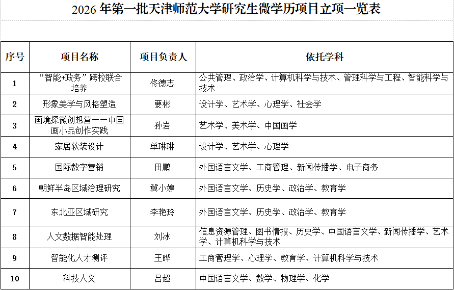 近年来,学校认真落实习近平总书记关于用好学科交叉融合“催化剂”的重要指示精神,于2025年成立天津师范大学学科交叉中心,着力打造“学科发展特区”,同年在“智能治理”“智慧教育”等前沿交叉方向启动学科交叉研究生培养实验班招生。此次微学历项目的设立,是学校在学科交叉领域落下的又一重要“先手棋”,以“小而精、高跨界、强赋能”的项目为支点,撬动跨学科课程体系建设和高层次复合型人才自主培养的深度变革。
