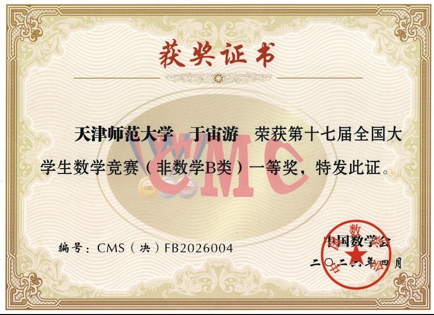 本站讯(通讯员 时晟蓉)近日,第17届全国大学生数学竞赛(CMC)总决赛在四川成都落幕。天津师范大学管理学院2023级工商管理专业学生于宙游,在指导教师刘宏鹏的悉心指导下,凭借扎实的数学功底和稳定的赛场发挥,荣获非数学B类(经管组)全国一等奖,位列全国第四名,创下我校学子在该项赛事该组别中的历史最佳成绩。