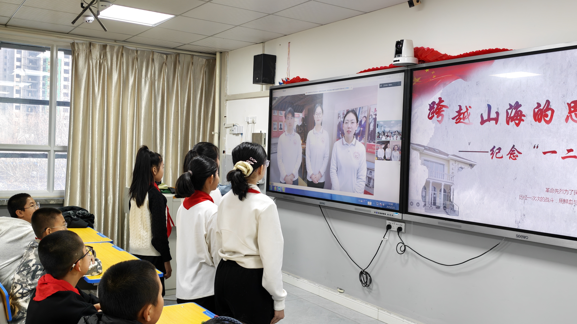 “华北之大,已经安放不得一张平静的书桌了!”宣讲团成员刘淇以这句振聋发聩的历史呐喊开篇,带领孩子们回溯了90年前那段烽火连天的岁月。一个个鲜活的故事、一句句铿锵的口号,通过屏幕直抵孩子们的心灵。