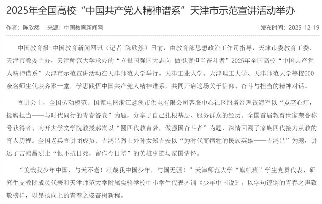 中国教育新闻网 | 2025年全国高校“中国共产党人精神谱系”天津市示范宣讲活动举办