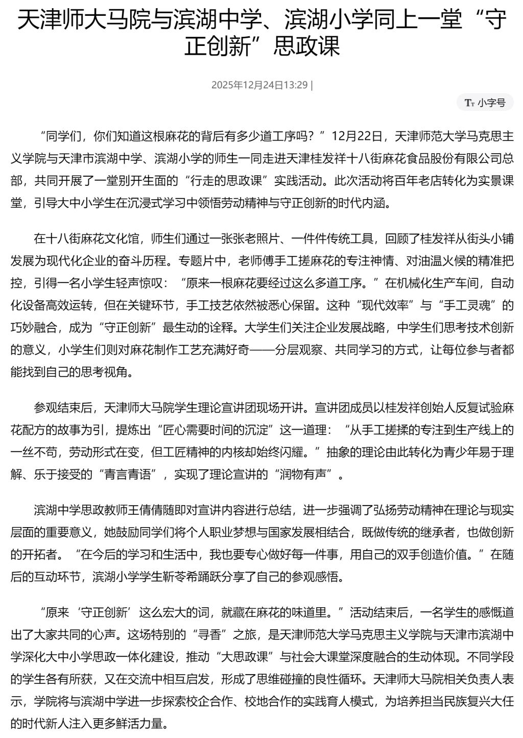 人民网 | 天津师大马院与滨湖中学、滨湖小学同上一堂“守正创新”思政课