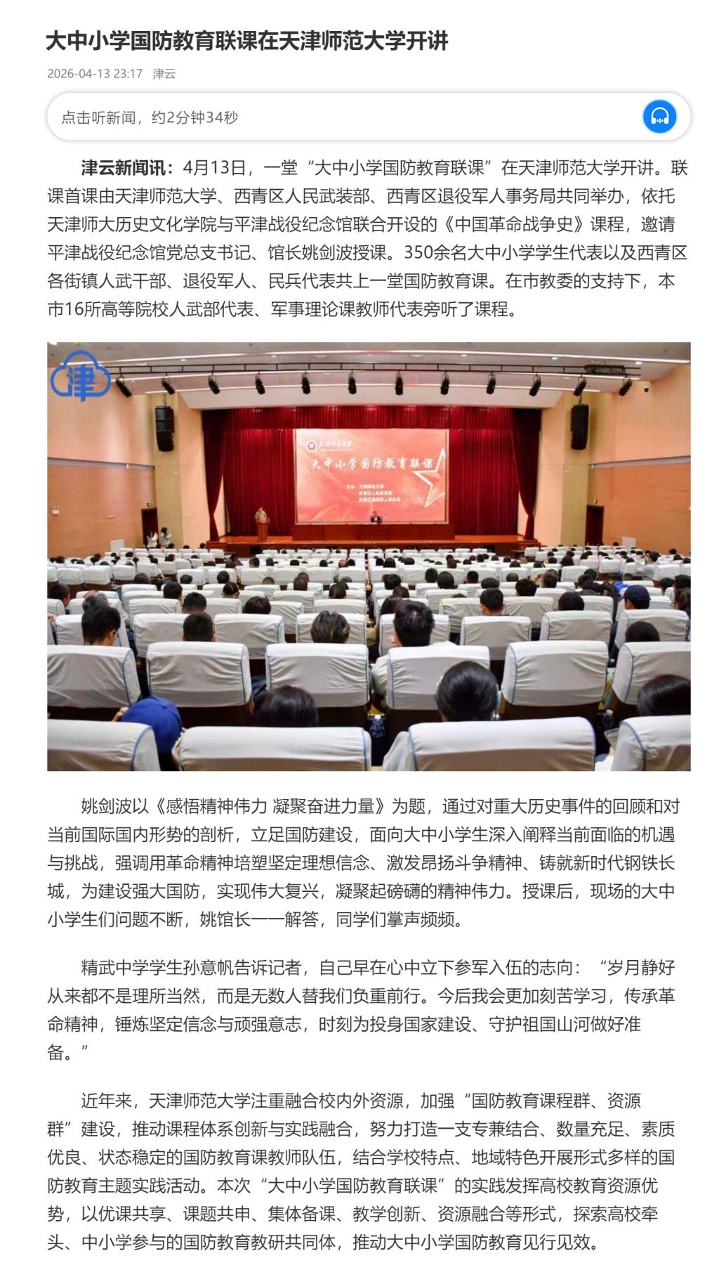 津云 | 大中小学国防教育联课在天津师范大学开讲