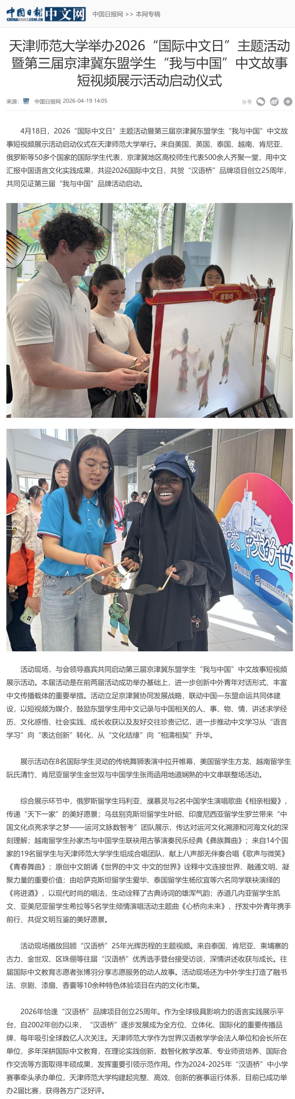 中国日报网 | 天津师范大学举办2026“国际中文日”主题活动暨第三届京津冀东盟学生“我与中国”中文故事短视频展示活动启动仪式
