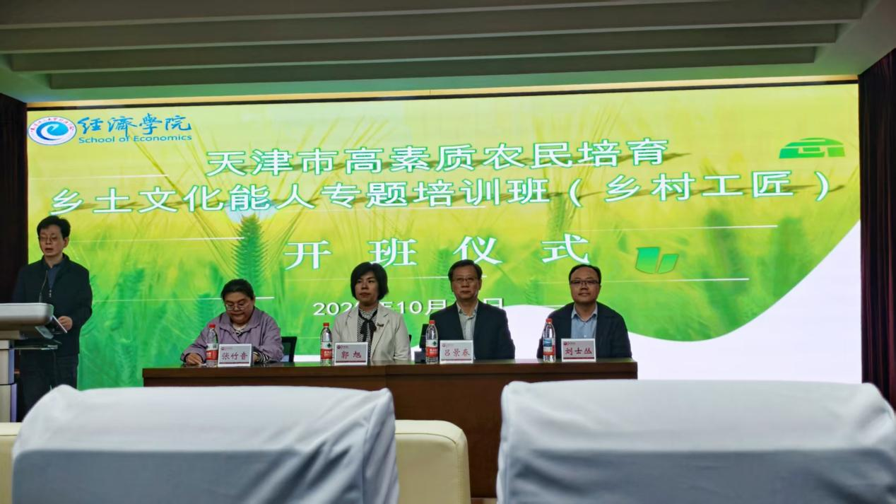 本站讯(通讯员 白帆)为进一步提升经济学院服务社会能力,扩大学院社会影响力,10月14日,2025年天津市高素质农民培育乡土文化能力(乡村工匠)市级培训班在天津师范大学国家治理研究院报告厅正式拉开帷幕。市农业农村委社会事业处副处长刘士丛、副处长张竹音,有关行业专家与来自全市10个涉农区的40余名优秀农民学员齐聚一堂,共启乡村振兴人才培育新征程。经济学院党政主要领导出席开班仪式。