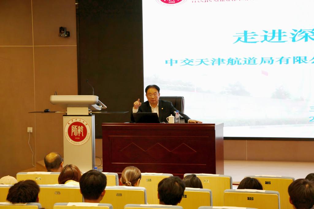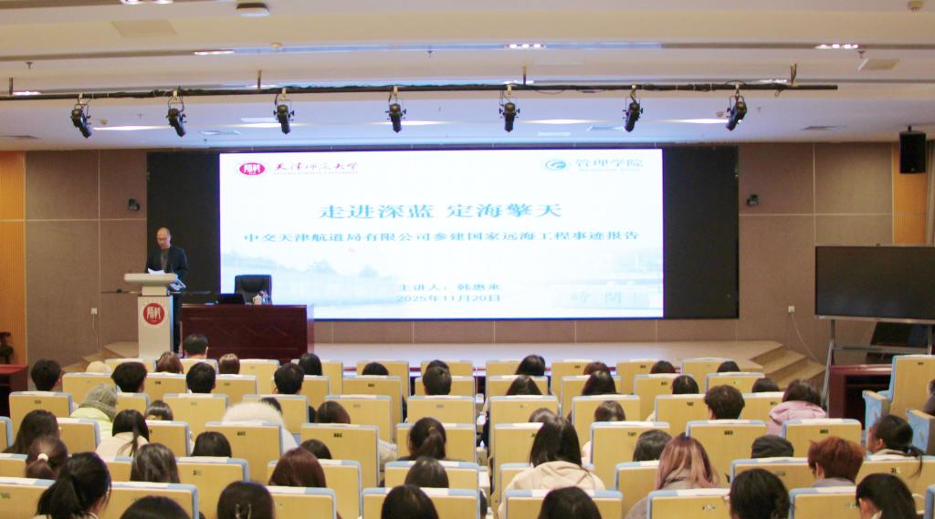 “大国工程背后,是建设者们以海为纸、以船为笔写下的奋斗诗行。”韩惠来以亲身经历为线,讲述了中交天航局参与国家远海工程的奋斗历程。他从深海航道昼夜疏浚讲到远海岛礁项目建设,通过台风中的设备检修、团队协作的不眠之夜、缺水少粮环境下的坚守等真实场景,展现了中交天航人“敢闯深蓝、勇担使命”的工匠精神,让在场师生深切感受到“海洋强国”战略背后的奉献与担当。