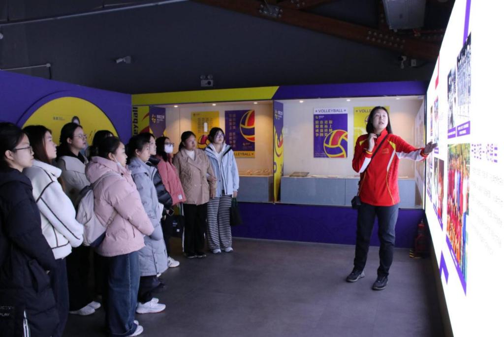 在天津体育博物馆“海河回响——女排精神展”展厅,天津女排前主攻手张晓宇为师生们带来了一场生动的讲解。她结合自身训练与比赛经历,讲述了天津女排多年来不畏艰难、勇攀高峰的奋斗历程。展厅中陈列的历史照片与实物,配合冠军球员的讲述,再现了天津女排接续奋斗的峥嵘岁月。