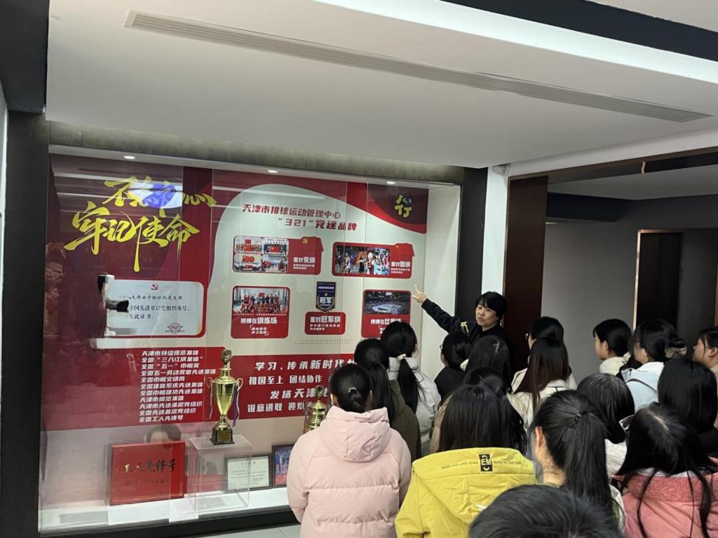 随后,师生们前往天津女排训练基地,实地观摩运动员的日常训练。在复康路训练基地,天津市排球运动管理中心党支部书记、天津女排领队张静坤介绍了管理中心的党建工作,并带领师生走进训练现场。场馆内,发球、扣球、拦网的声音不绝于耳,队员们反复打磨每一个技术动作,不断调整姿势,在地面上翻滚扑救,力求精准到位。师生们安静驻足,亲眼见证了专业运动员如何通过科学训练与严格自律,保持最佳竞技状态,也深切体会到竞技体育背后的汗水与坚持。