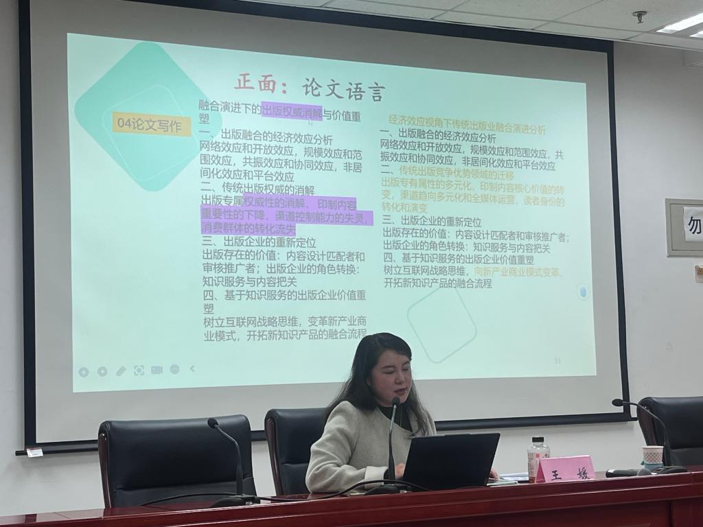 在论文写作指导环节,王媛从选题定位、标题提炼、主题表达、语言风格到参考文献规范等方面做了全面讲解。她结合多个学术出版领域的典型案例,提出了一系列实操性强、针对性突出的具体建议,为优质论文选题明确了核心标准,即研究问题需具备清晰的学理依据与创新价值,研究方法需兼具规范性与适配性,研究过程与结论需彰显科学性与可信度。同时,王媛特别强调论文主题措辞的严谨性、参考文献格式的规范性,提醒大家注重将非学术性语言转化为专业表述,并建议大家在长期研究中凝练形成自身独特的学术身份标签与研究特色,助力学术影响力的持续积累。