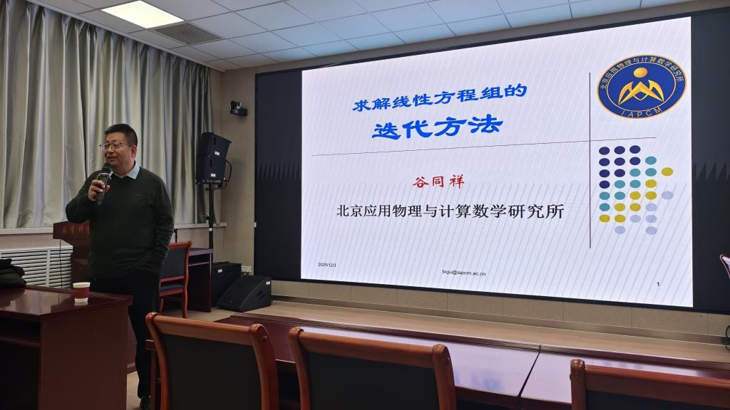 报告中,谷同祥研究员首先为师生们科普了线性方程组求解在科学计算领域的核心地位,强调在新时代背景下夯实专业基础对学术研究与技术创新的重要意义。他摒弃复杂冗余的理论推导,以统一框架为脉络,系统梳理了迭代法的起源、发展历程、核心分类及关键技术突破,让抽象的数学方法变得清晰易懂。