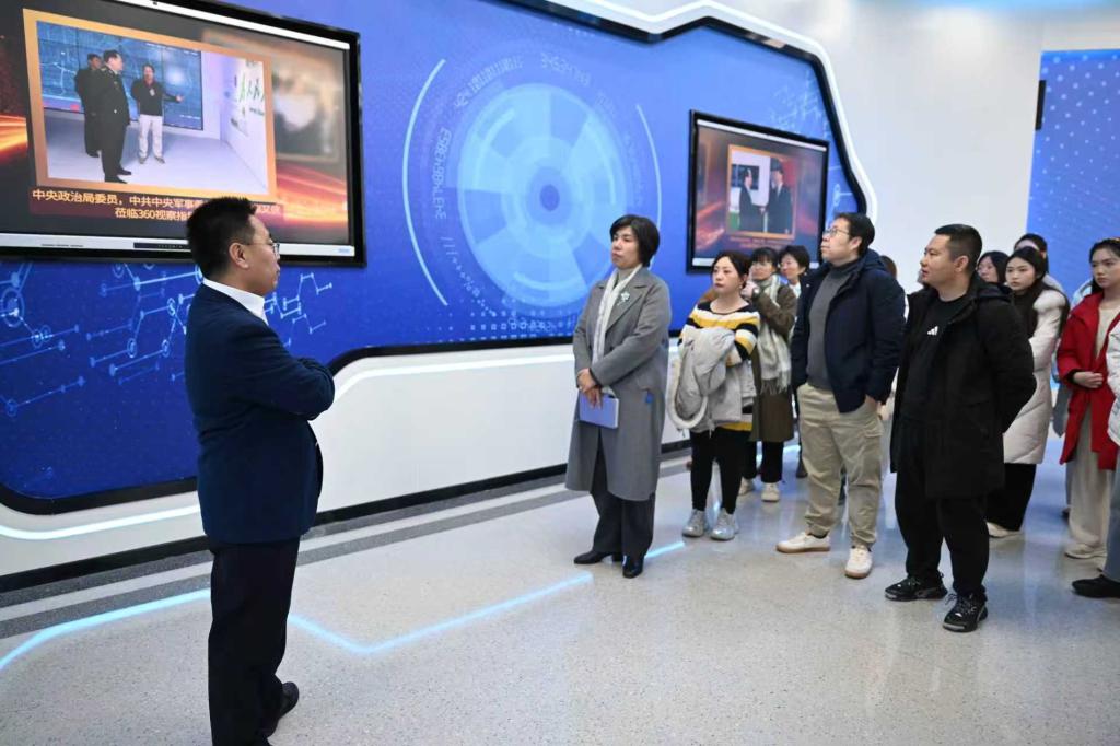 走进360集团天津总部的展厅,在企业工作人员引导下,师生参观了大模型技术实验室、国家大数据靶场、车联网、网络空间测绘中心等多个展厅和实验室。深入了解360公司在网络安全领域的前沿技术、创新成果以及业务模式。