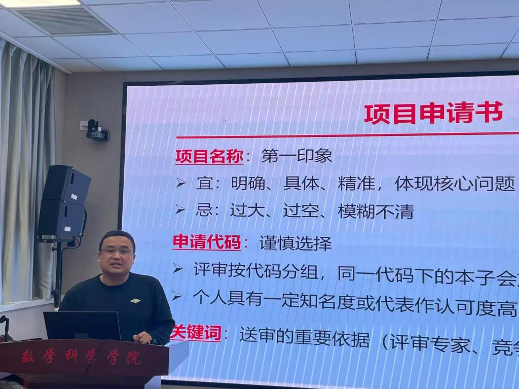 常慧宾结合自身作为项目申请人与基金评审专家的双重角色进行了经验分享。从申请人角度,他以个人申报案例为基础,系统讲解了申报书撰写的关键环节与实用技巧。从通讯评审和会评专家视角,深入剖析了国家自然科学基金项目的评议标准与关注要点。随后,他详细介绍了学院制定的《数学科学学院2026年度国家自然科学基金项目申报工作方案》,明确了“全员动员、提前谋划、精准指导、提质增效”的工作原则,并对各项任务的时间节点与责任分工作了具体说明。