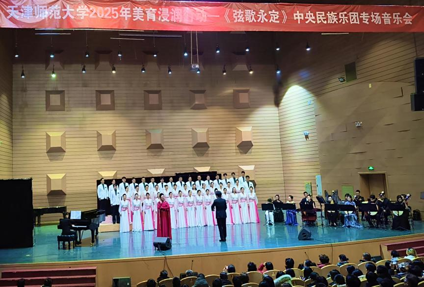 本站讯(通讯员 卜一凡)日前,由北京艺术基金2024年度资助、天津师范大学团委主办、音乐与影视学院承办的2025年美育浸润行动——《弦歌永定》中央民族乐团“中国民歌地图”系列专场音乐会在天津师范大学音乐厅上演。我校800余名师生共同享受在这场高水准的民族音乐盛宴,感受中华优秀传统文化的博大精深与时代魅力。音乐会由青年指挥家刘钰执棒,杨潺担任主持。