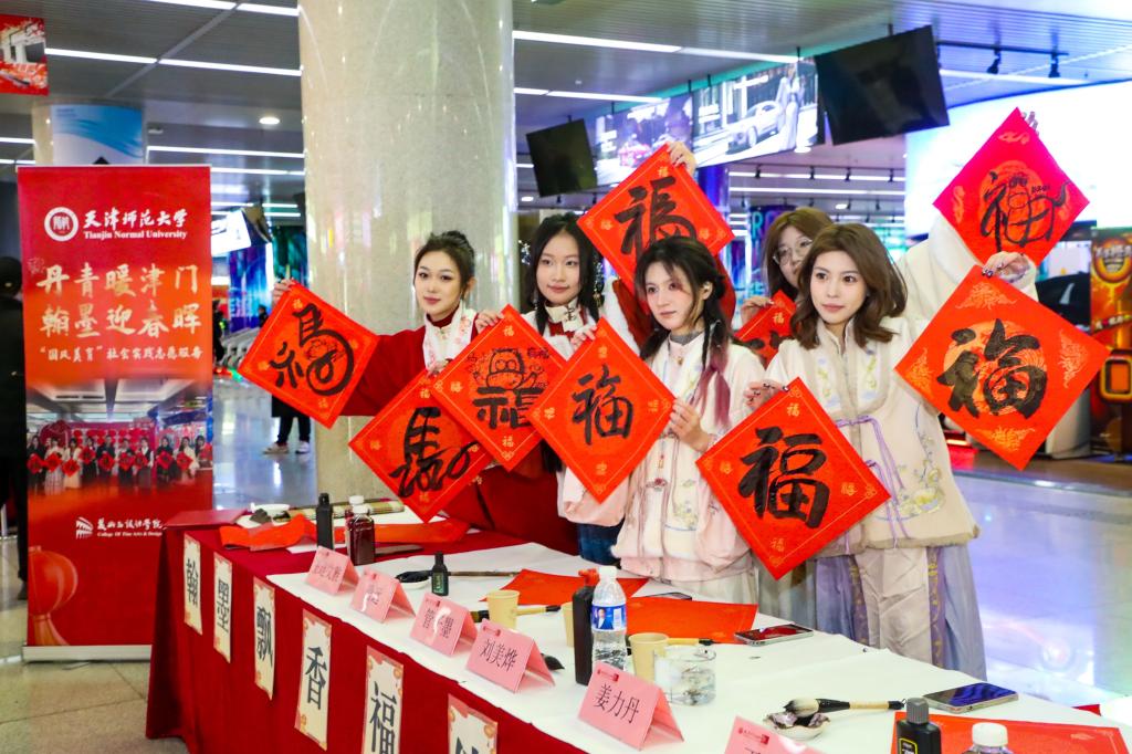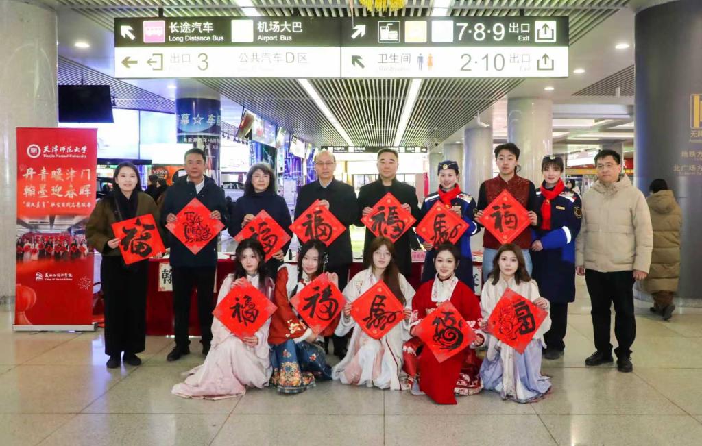 与此同时,美术与设计学院学生开展了多场“送万福、进万家”书法公益活动。他们铺开红纸,饱蘸浓墨,笔锋游走间,苍劲有力、飘逸灵动的“福”字与春联跃然纸上,每一幅作品都饱含吉祥寓意与美好愿景。这些带着墨香的福字与春联,让活动成为天津站“春运”里一道温暖风景线,既为游子送上祝福、装点旅途,也成了旅客津津乐道的亮点。这些饱含心意的书法作品作为文化载体,既彰显天津古今交融的城市内涵,更传递出这座城市对旅客的满满温情。