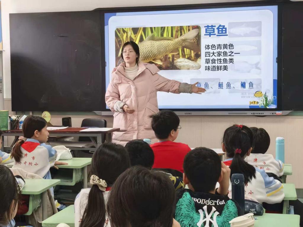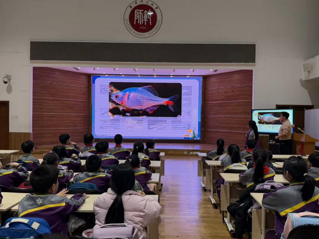 课堂上,志愿者们围绕天津“母亲河”海河的生态保护,结合学院科研团队开展的海河“鱼口普查”工作,将专业的科研数据、生态知识转化为孩子们易于接受的“童言童语”,向孩子们讲述科研背后的故事。志愿者们还通过鱼类标本讲解,带领孩子们观察鲫鱼、鲤鱼等海河“原住民”的模样,帮助孩子们进一步了解海河鱼类的种类、生存现状及保护水资源与生物多样性的重要意义。