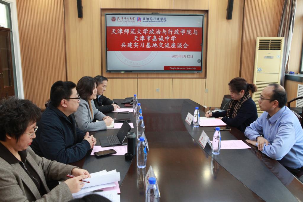 本站讯(通讯员 于淼)为深化院校合作,搭建优质实践育人平台,切实提升学生专业实践能力与就业竞争力,3月12日上午,政治与行政学院与天津市嘉诚中学举行共建实习基地交流座谈会,双方围绕实习基地共建等事宜展开深入研讨并达成合作意向。天津市嘉诚中学副校长张然、窦琭,政治与行政学院领导班子成员参加座谈。