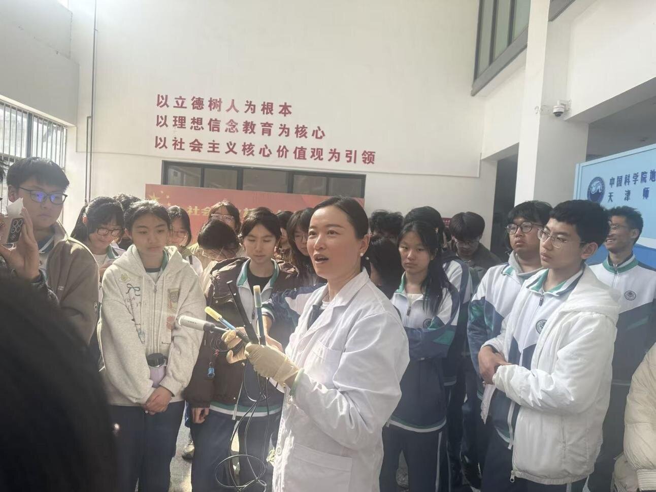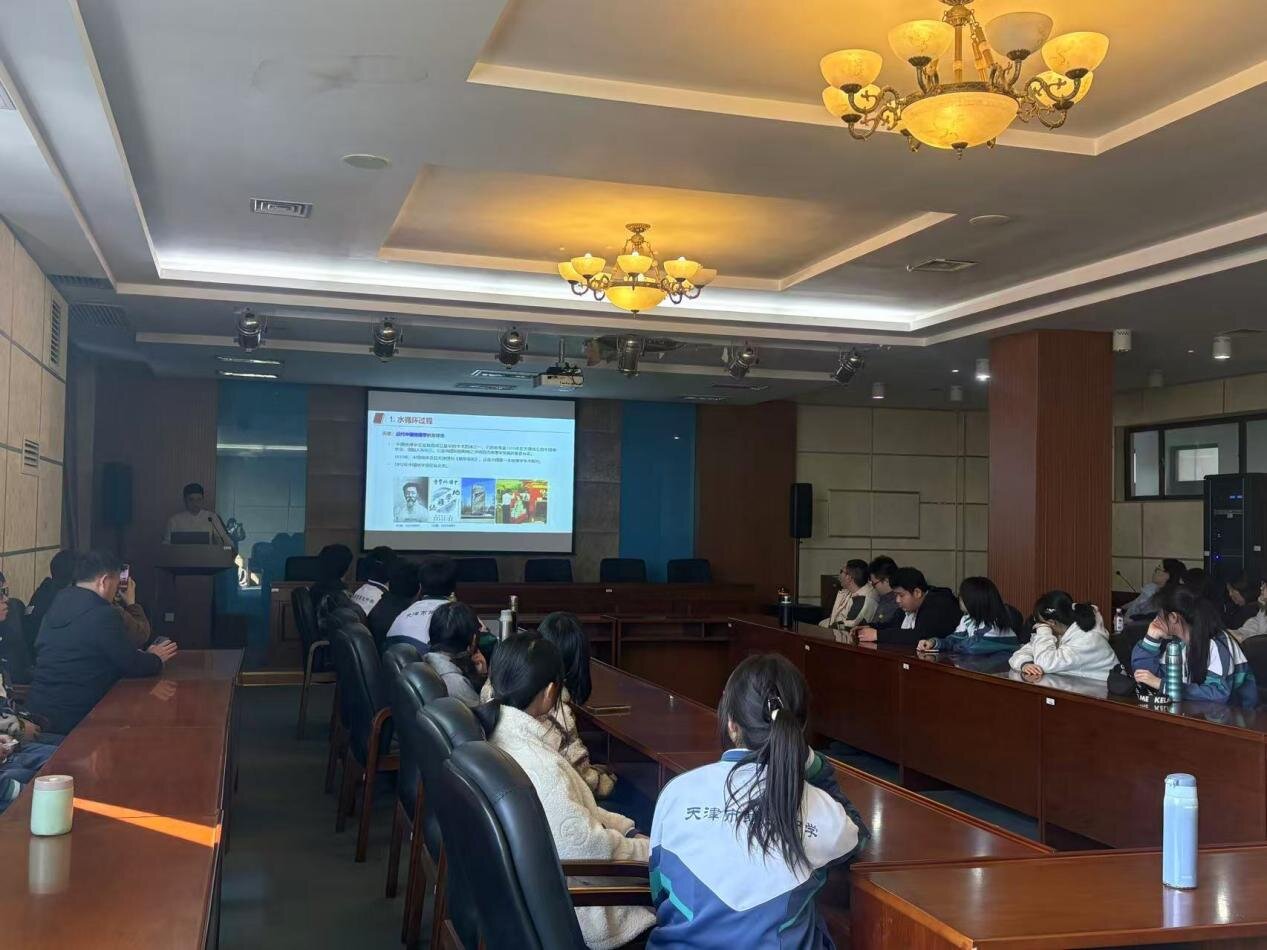 最后的科普报告环节,实验室老师将同学们的视野从微观样本拉向宏观格局,立足地球系统科学视角,运用同位素示踪技术,生动解析水的“前世今生”;结合全球淡水分布数据,阐明我国水资源“总量多、人均少、分布不均”的现状,介绍国家水网构建的“四横三纵、南北调配、东西互济”配置格局;以天津为案例,讲述南水北调工程的奇迹和效益,展现“干渴之城”向“河湖复苏、候鸟云集”生态转变。