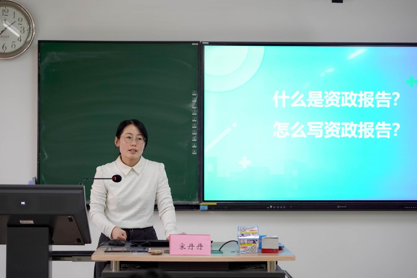 在实操指导环节,宋丹丹介绍了咨政报告的行文结构与写作技巧,并就信息收集方法、AI工具辅助使用注意事项作了重点说明。她结合学院学科特色及中宣部相关政策,鼓励广大师生将学术研究与国家战略需求紧密结合,积极投身咨政报告写作实践。她表示,咨政研究为研究生参与智库建设提供了重要途径,希望大家多写多练,在实践中不断锤炼履职建言的本领。