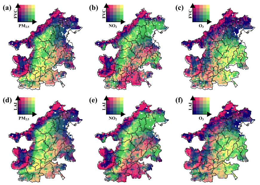 图1 典型大气污染输送通道区域植被削减空气污染物空间格局。双变量空间分布图分别对应2013-2022年均值尺度的植被覆盖度(FVC)和叶面积指数(LAI),以及PM2.5、NO2、O3浓度。植被密度较高的山前丘陵和生态屏障区普遍对应较低污染水平,而植被密度较低的城市与交通廊道则与PM2.5、NO2高值区高度重叠,为识别大气污染高风险区域和优先增绿带提供空间依据。