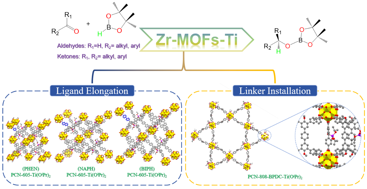 图1. 适用于大尺寸羰基底物硼氢化的锆基金属有机骨架(Zr-MOFs)孔道尺寸调控策略图。