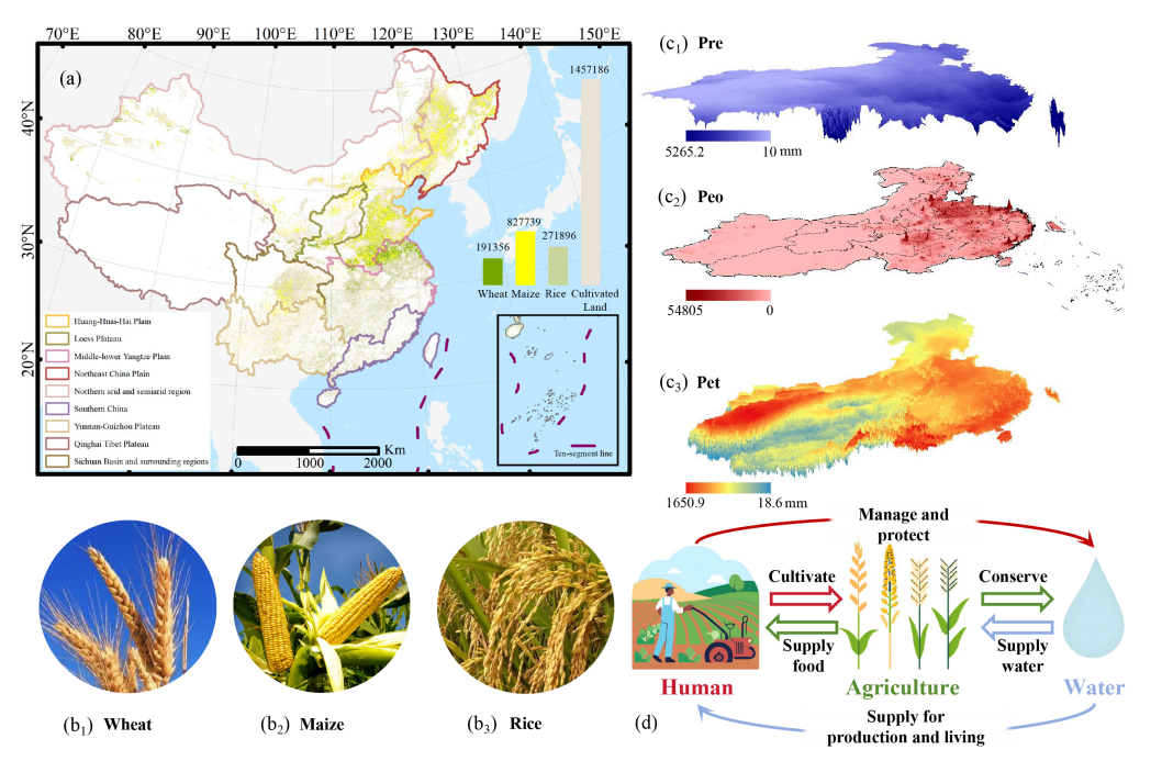 图1 研究区概况。a)中国九大农业区、耕地分布及空间范围示意图,并附三大主粮作物(玉米、水稻和小麦)种植面积柱状图;b)三类主要主粮作物示意图;c1–c3)中国降水量、蒸散发量与人口密度的空间分布格局,显示显著的区域异质性,尤其体现在东部地区人口高度集聚特征。单位:Pre 表示降水量(mm),Peo 表示人口密度,Pet 表示潜在蒸散发量(mm);d)人类活动在农业生产中作用机制的概念示意图。