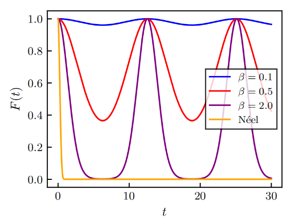 图2 疤痕态塔对应的相干动力学回复。右侧图展示了不同参数下初态保真度随时间演化的周期性回复行为。
